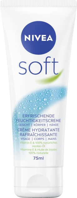 Die Nivea Soft erfrischende Feuchtigkeitscreme verleiht Ihrer Haut einen belebenden Frische-Kick und ist für die tägliche Anwendung geeignet. Die leichte Formel mit Vitamin E und 100% natürlichem Jojoba-Öl spendet Ihrer Haut 48h intensive Feuchtigkeit, zieht schnell ein und klebt nicht. Ihre Haut ist fühlbar entspannter, erfrischter und weicher. Jetzt testen: Nivea Soft Tube 75ml. 100% klimaneutralisiertes Produkt*.