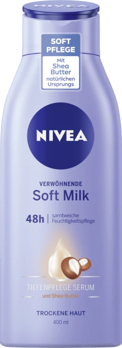 Für alle, die mehr als nur Feuchtigkeit von einer Body Lotion erwarten. Die NIVEA Verwöhnende Soft Milk bietet 3 in 1: 48h Pflege, Geschmeidigkeit und natürlich schöne Haut. Sie ist angereichert mit dem NIVEA TIEFENPFLEGE SERUM und wertvoller Shea-Butter, für verwöhnte, geschmeidige Haut. Mit nur einer Anwendung sorgt sie für ein samtweiches Hautgefühl und versorgt die Haut 48h mit intensiver Feuchtigkeit. Für einen Effekt den Sie nicht nur fühlen, sondern auch sehen können: NIVEA Verwöhnende Soft Milk.