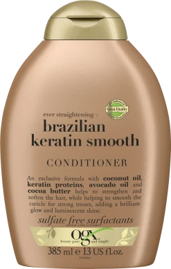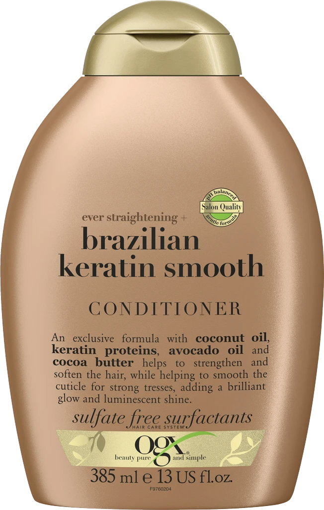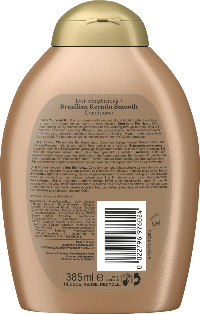 Water (Aqua), Cetearyl Alcohol, Cetyl Alcohol, Behentrimonium Chloride, Glycerin, Hydrolyzed Keratin, Cocos Nucifera (Coconut) Oil, Persea Gratissima (Avocado) Oil, Theobroma Cacao (Cocoa) Seed Butter, Aloe Barbadensis Leaf Juice, Glycol Stearate, Glycol Distearate, Ceteareth-20, Isopropyl Alcohol, Dimethicone, Cyclotetrasiloxane, Citric Acid, Cyclopentasiloxane, Panthenol, Tetrasodium EDTA, DMDM Hydantoin, Methylchloroisothiazolinone, Methylisothiazolinone, Red 40 (CI 16035), Yellow 5 (CI 19140), Blue 1 (CI 42090), Fragrance (Parfum).
