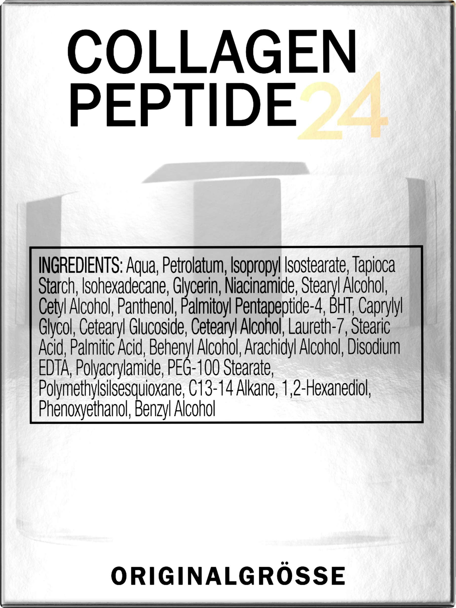 Aqua, Petrolatum, Isopropyl Isostearate, Tapioca Starch, Isohexadecane, Glycerin, Niacinamide, Stearyl Alcohol, Cetyl Alcohol, Panthenol, Palmitoyl Pentapeptide-4, BHT, Caprylyl Glycol, Cetearyl Glucoside, Cetearyl Alcohol, Laureth-7, Stearic Acid, Palmitic Acid, Behenyl Alcohol, Arachidyl Alcohol, Disodium EDTA, Polyacrylamide, PEG-100 Stearate, Polymethylsilsesquioxane, C13-14 Alkane, 1.2-Hexanediol, Phenoxyethanol, Benzyl Alcohol.