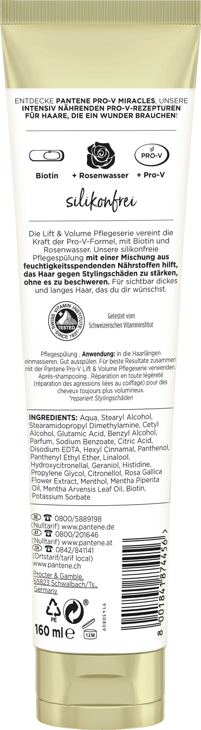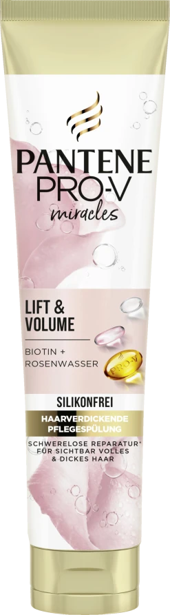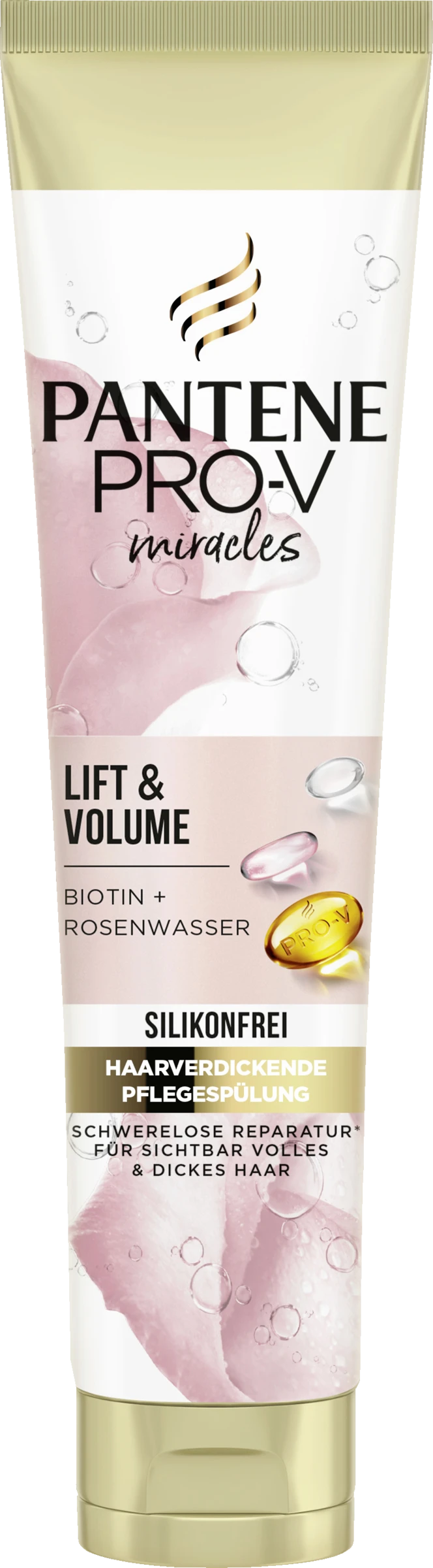 Die Lift & Volume Pflegeserie vereint die Kraft der Pro-V Formel, mit Biotin und Rosenwasser. Unsere silikonfreie Pflegespülung hilft, das Haar gegen Stylingschäden zu stärken, indem es mit Nährstoffen versorgt wird. Für sichtbar dickes und langes Haar.