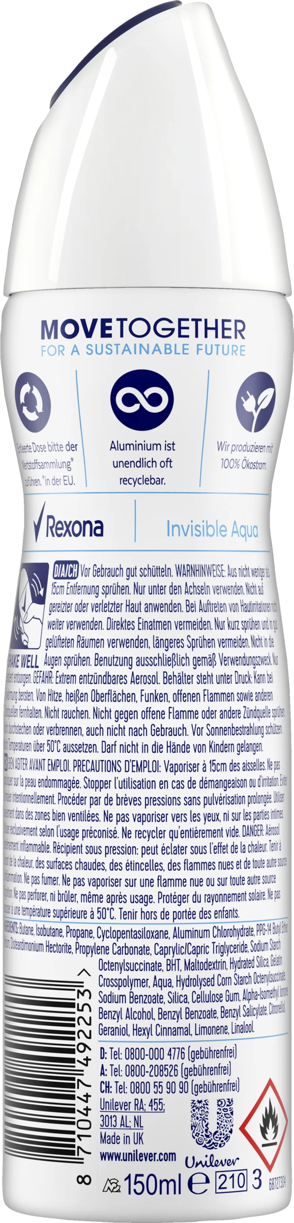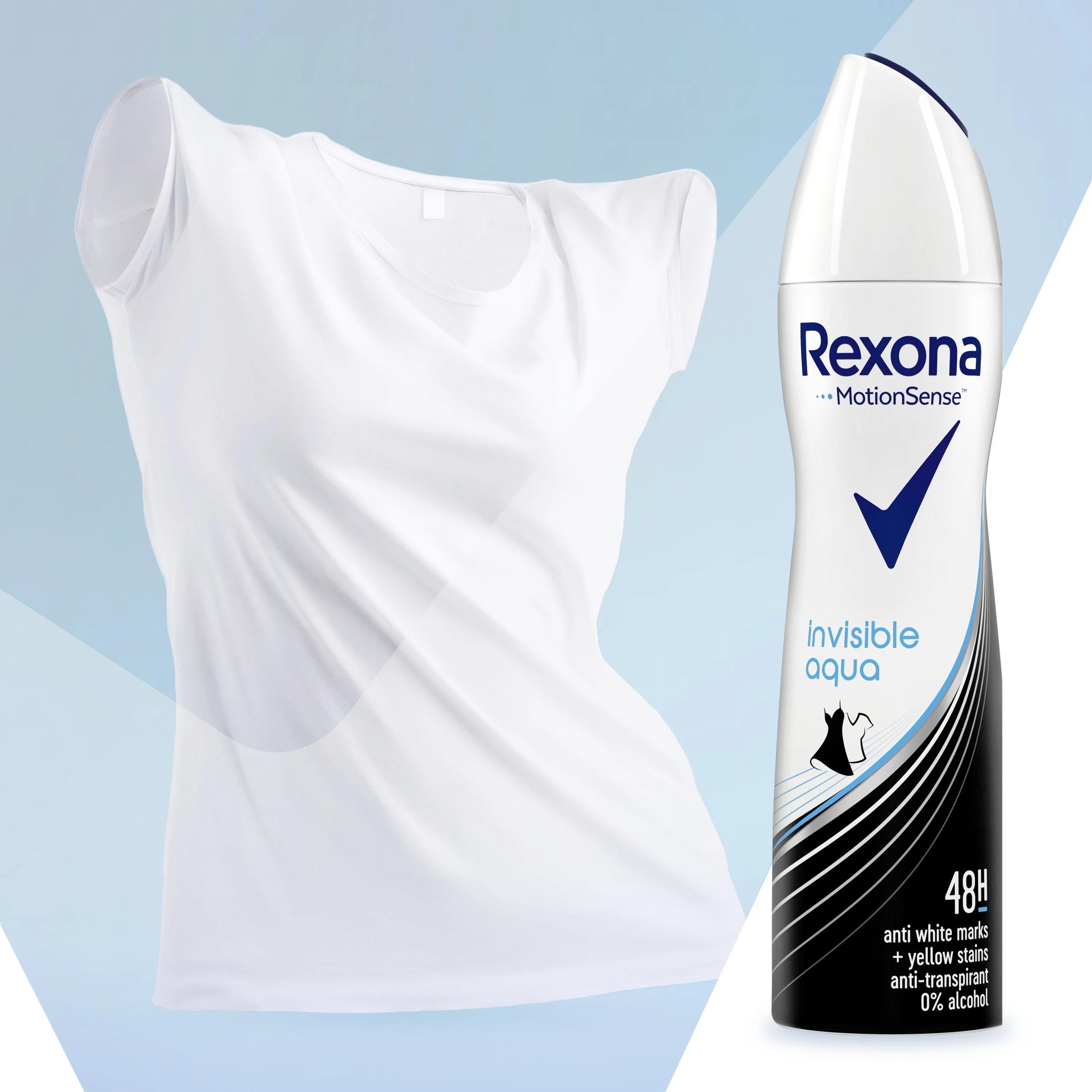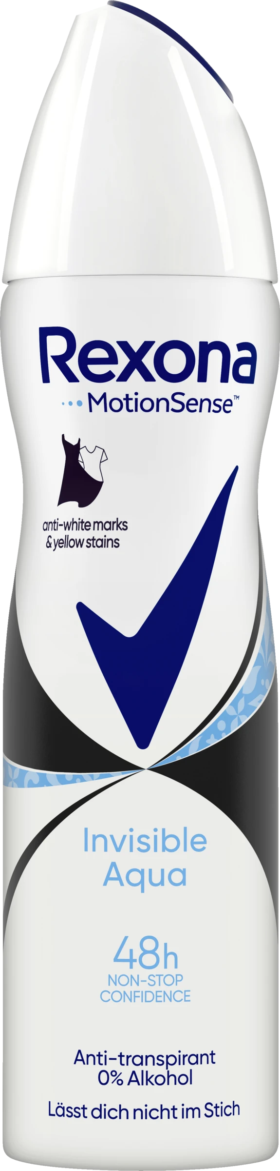 Weiße oder gelbe Flecken auf der Kleidung? Das muss nicht sein, denn das Rexona Anti-Transpirant Spray Invisible Aqua schützt vor Flecken auf der Kleidung. Dank der speziellen Technologie von Rexona haben Deo-Rückstände und Schweißflecken auf der Kleidung keine Chance. Außerdem schützt es 48 Stunden lang effektiv vor Achselnässe und Körpergeruch.