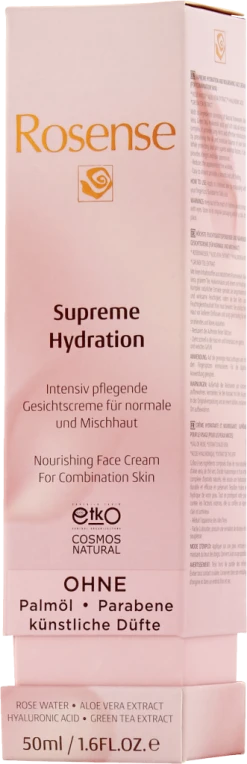 Die speziell für die normale Haut und Mischhaut entwickelte Supreme Hydration Intensiv pflegende Gesichtscreme von Rosense sorgt für ein strahlendes und klares Erscheinungsbild. Die mit natürlichem Rosenwasser, Aloe Vera, grünem Tee, Hyaluronsäure und einem reichhaltigen Komplex aus natürlichen Extrakten angereicherte Formel bewahrt optimal den Fett- und Feuchtigkeitsgehalt der Haut und sorgt so dafür das sie langanhaltend hydratisiert ist. Darüber hinaus schützt die Pflegerezeptur die Haut hervorragend vor äußeren Einflüssen.