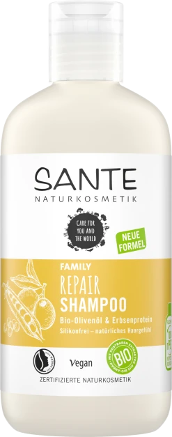 Das SANTE FAMILY Repair Shampoo mit Bio-Olivenöl und Erbsenprotein für strapaziertes und geschädigtes Haar pflegt und verbessert die Haarstruktur. Die natürlich wirksame und milde Reinigungsformel stärkt und glättet das Haar.