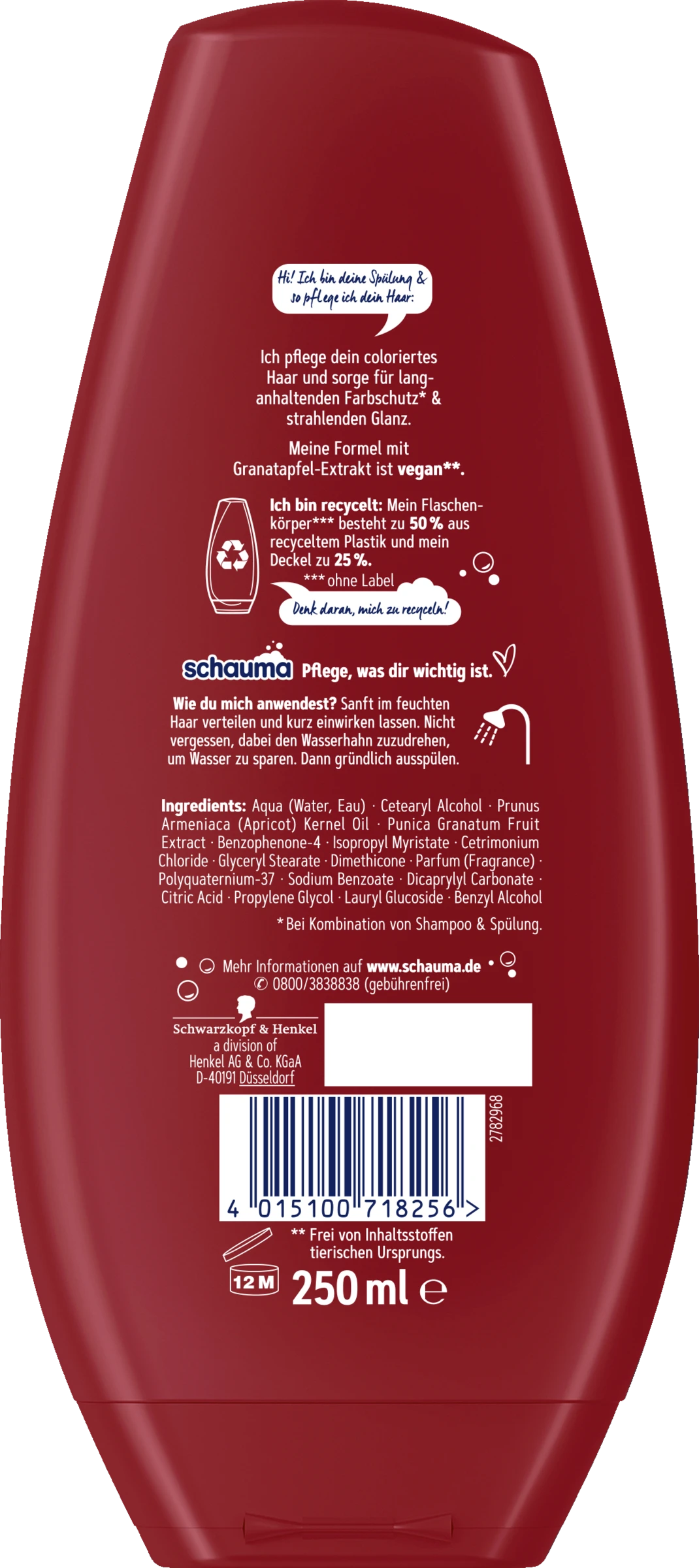 Hi! Ich bin deine Spülung & so pflege ich dein Haar. Ich pflege dein coloriertes Haar und sorge für langanhaltenden Farbschutz* & strahlenden Glanz. Meine Formel mit Granatapfel-Extrak ist vegan**.
