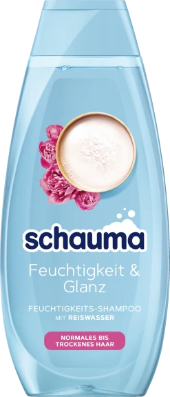 SCHAUMA Feuchtigkeit & Glanz Feuchtigkeits-Shampoo mit Reiswasser für normales bis trockenes Haar. Es reinigt sanft die Kopfhaut und versorgt das Haar von innen mit Feuchtigkeit. Für weiches, glänzendes & gesund aussehendes Haar. Die Formel mit Reiswasser und Pfingstrosenduft ist vegan* und silikonfrei.