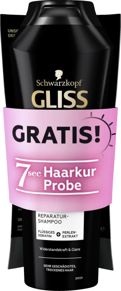 GLISS KUR Ultimate Repair Shampoo – Keratin Shampoo für stark geschädigtes Haar mit flüssigem Keratin Extrem geschädigtes Haar verliert Keratin, wodurch die Haarstruktur stark geschwächt wird. Das Haar braucht eine extreme Reparatur-Pflege, die den Keratinbestand wieder auffüllt. Das GLISS KUR Shampoo enthält flüssiges Keratin und Perlen-Extrakt, um Haarschäden zielgenau zu reparieren und den Keratinbestand wieder aufzufüllen. Bei Systemanwendung mit der Ultimate Repair Spülung verleiht das Repair Shampoo bis zu 90 % mehr Widerstandskraft und Glanz. Eine Kombination aus hochwertigen Haar-Aktivstoffen & Essenzen der Natur ist die Basis aller GLISS KUR Formeln. Sie sind auf die speziellen Bedürfnisse der Haare zugeschnitten und sorgen für Reparatur und eine sichtbar verbesserte Haarqualität. Die Produktvorteile im Detail: Shampoo für stark geschädigtes Haar Repariert Haarschäden und füllt den Keratinbestand wieder auf Mehr Widerstandskraft und Glanz* Mit flüssigem Keratin + Perlen-Extrakt Anwendung: Sanft im feuchten Haar verteilen. Gut ausspülen! Regelmäßig anwenden.*Bei Systemanwendung mit der Ultimate Repair Spülung ;Unsere Formelinnovation: Repariere dein Haar in nur 7 Sekunden. Effektiv wie eine 5-Minuten Kur in nur 7 Sekunden! Verwandelt sich bei Anwendung in eine cremige Textur, für glänzendes, repariertes Haar und das ohne Silikone.