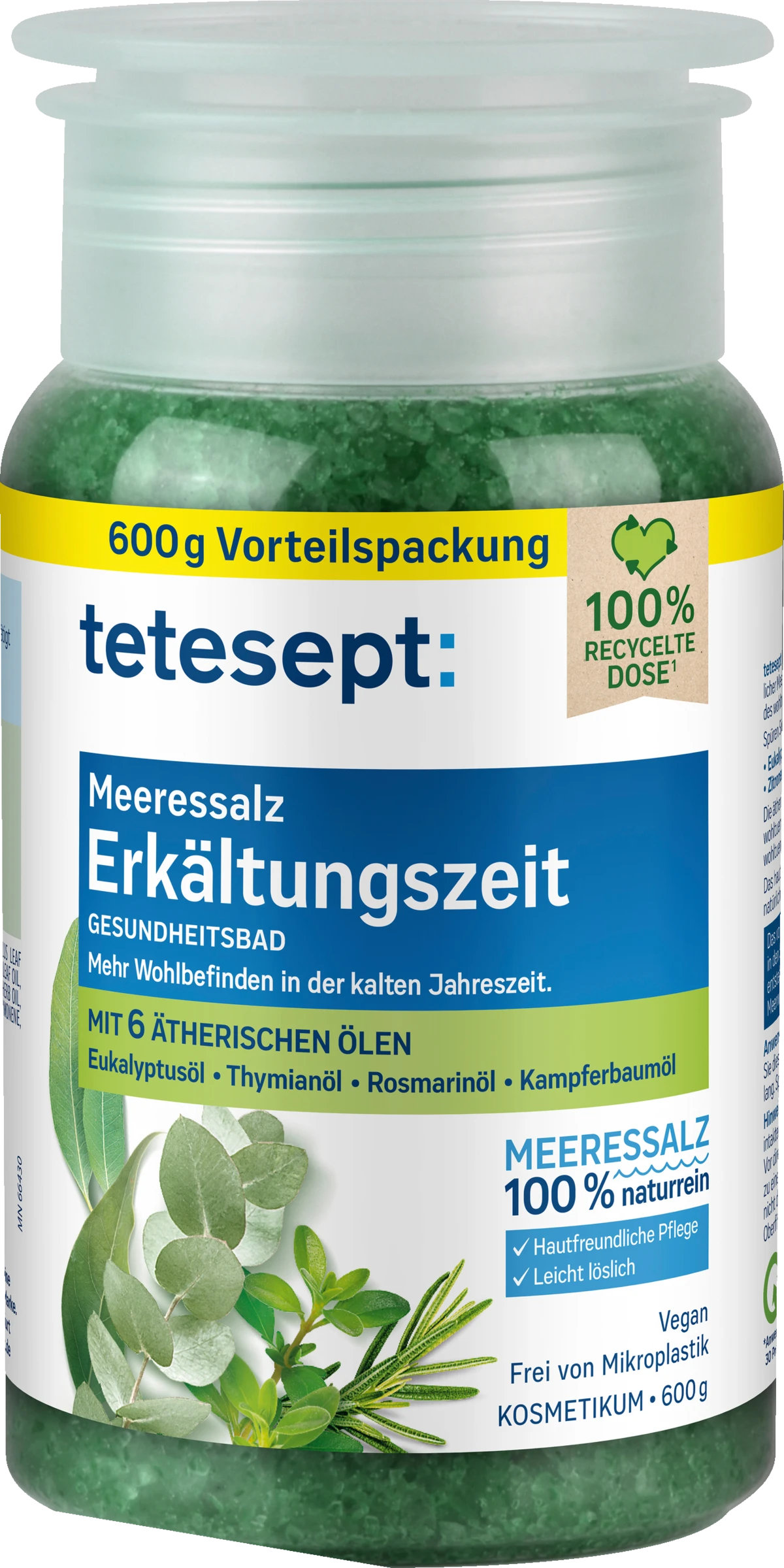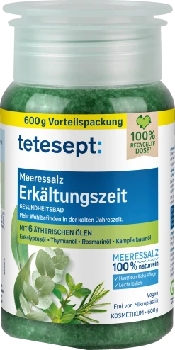 tetesept Meeressalz Erkältung ist ein spezieller Badezusatz auf hautgesunder Meeressalz-Basis zur Verbesserung des Wohlbefindens in der Erkältungszeit. Gut für die Atemwege.