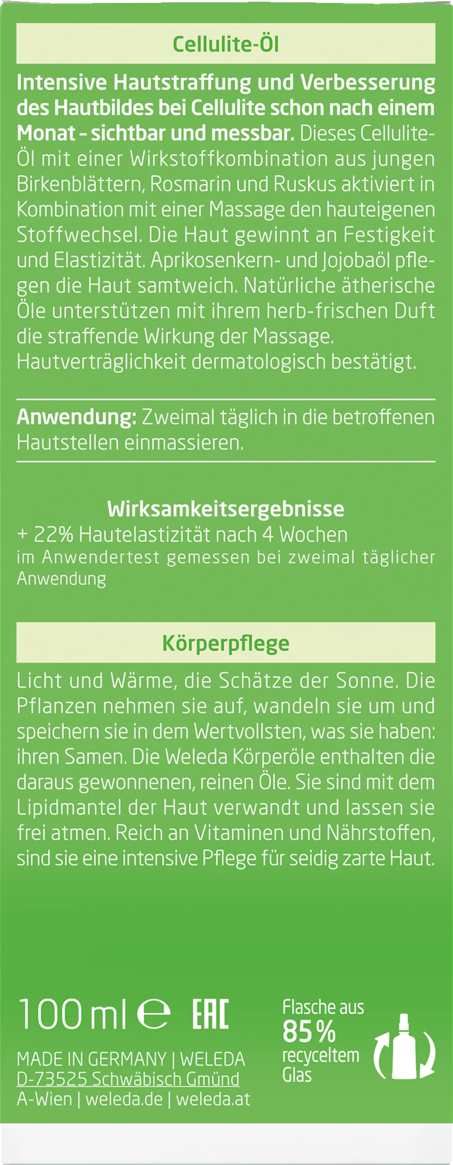 Das Birke Cellulite-Öl verleiht Ihrer Haut neue Spannkraft, macht sie glatter, straffer und verwöhnt mit einem herb-frischen Duft. Das 100 ml Birke Cellulite-Öl jetzt mit Spender.